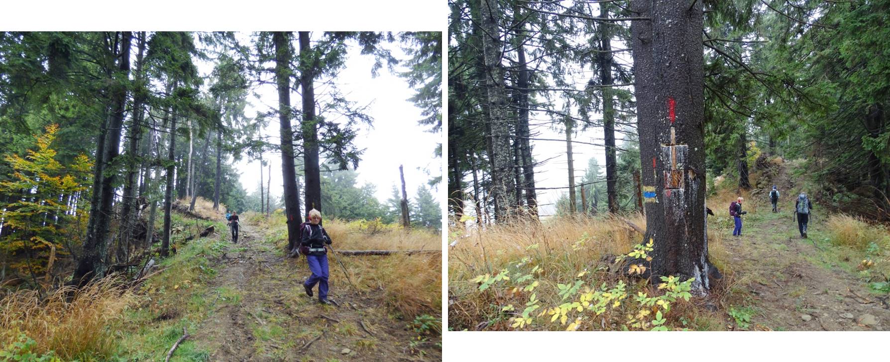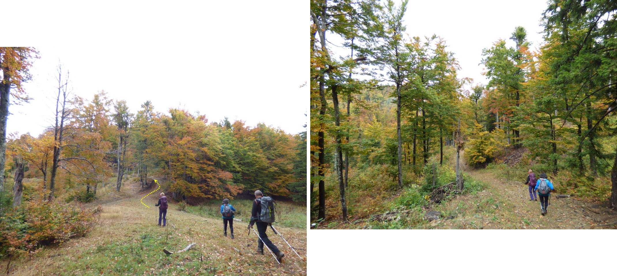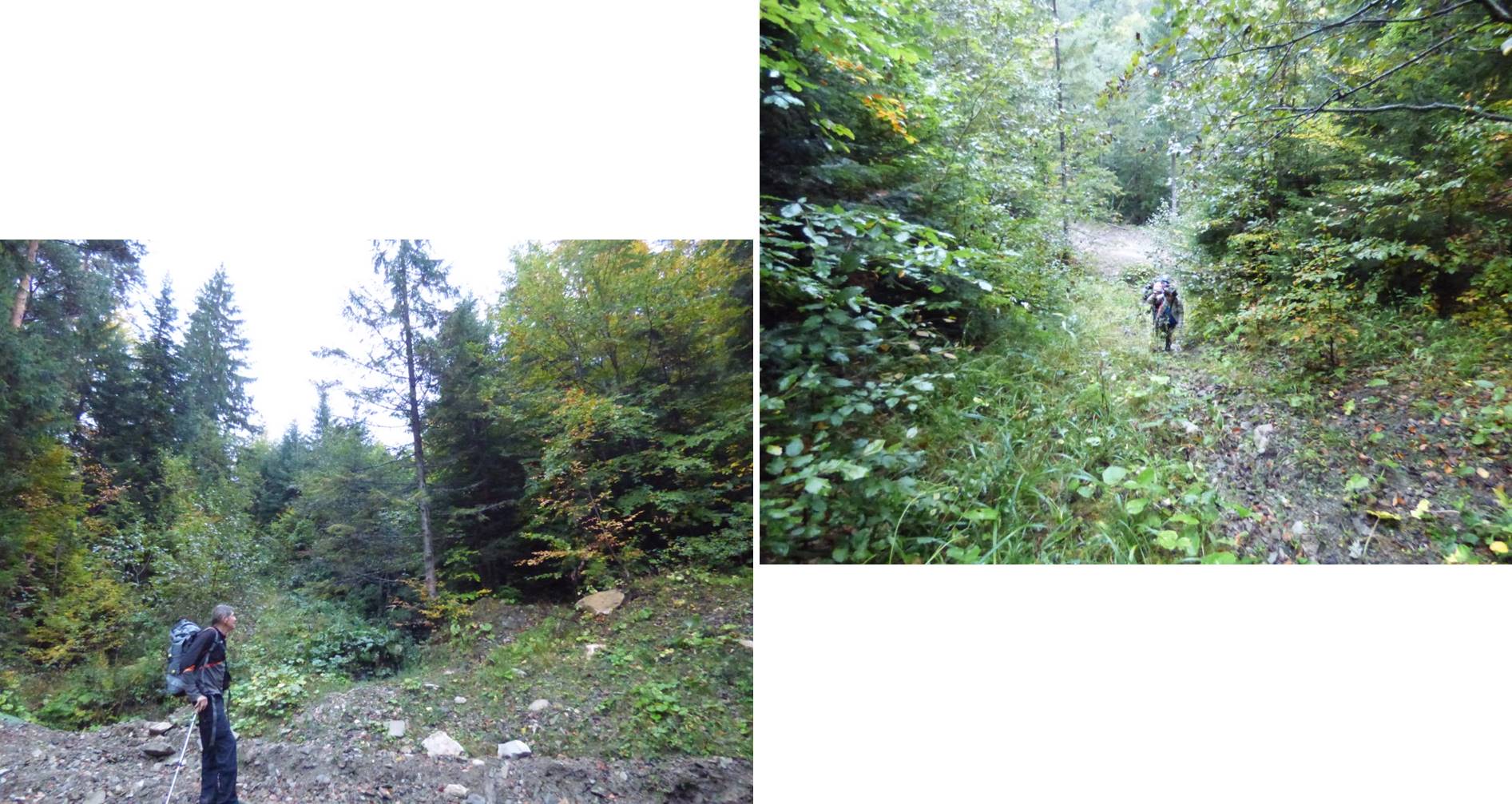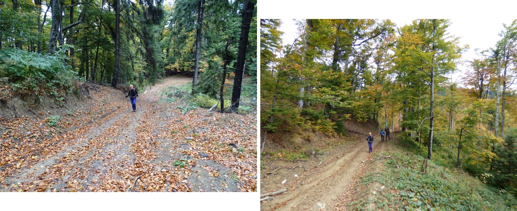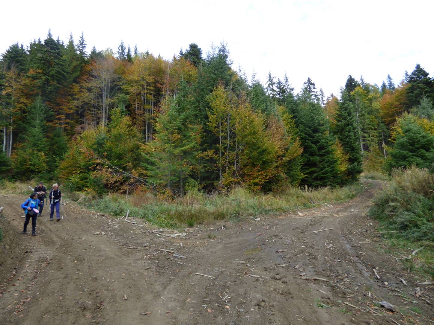 Culoarul sfârșește iar spre stânga coboară, puțin vizibile, urmele drumului de tractor; la fel fac și marcajele silvice, …