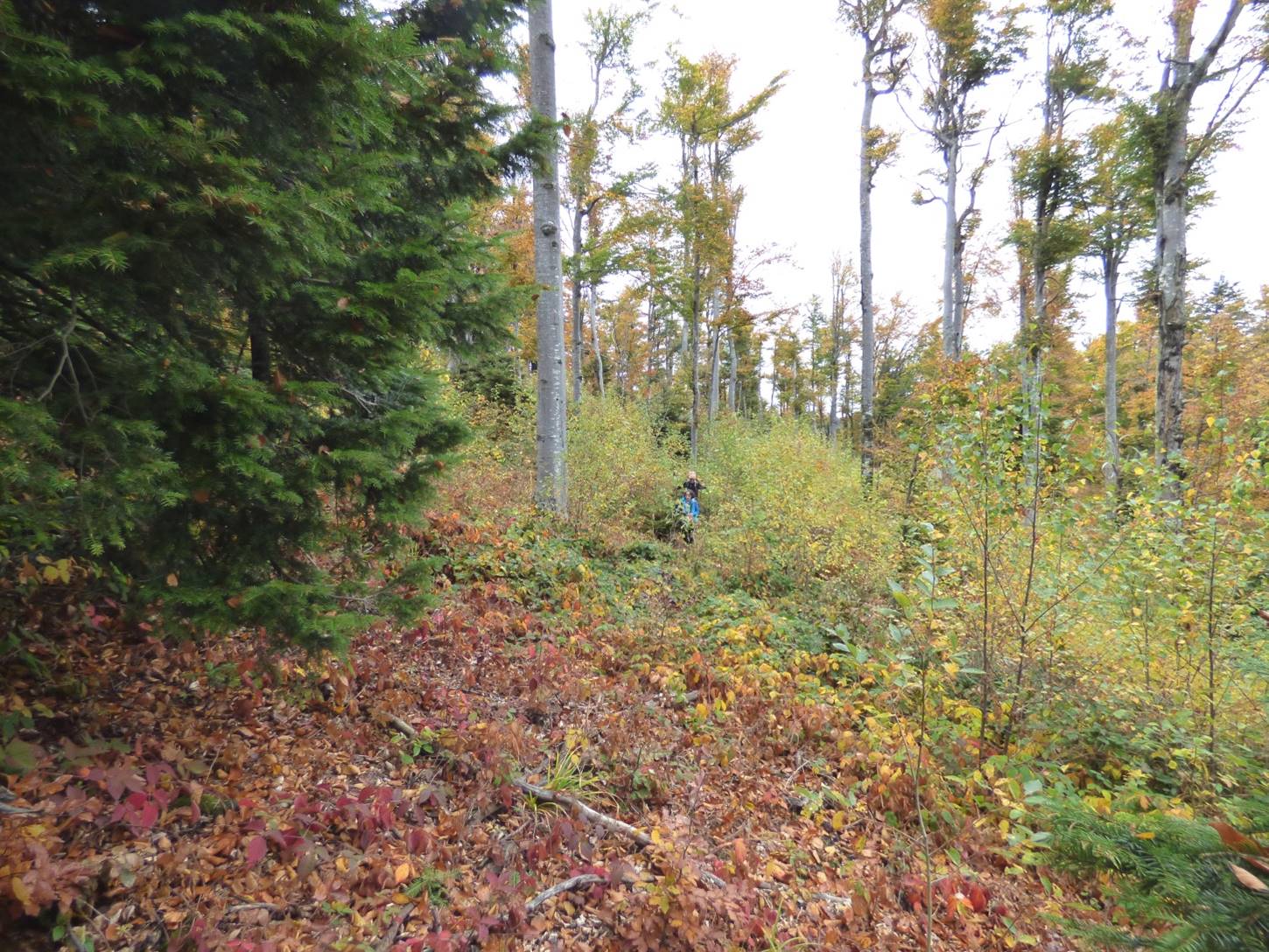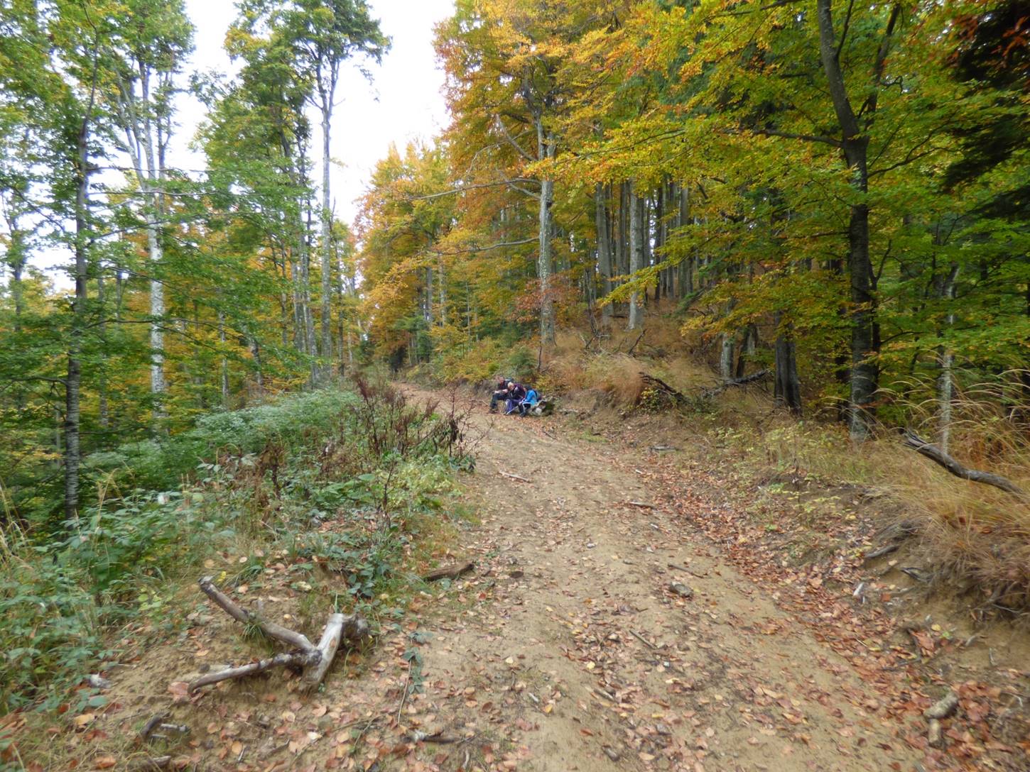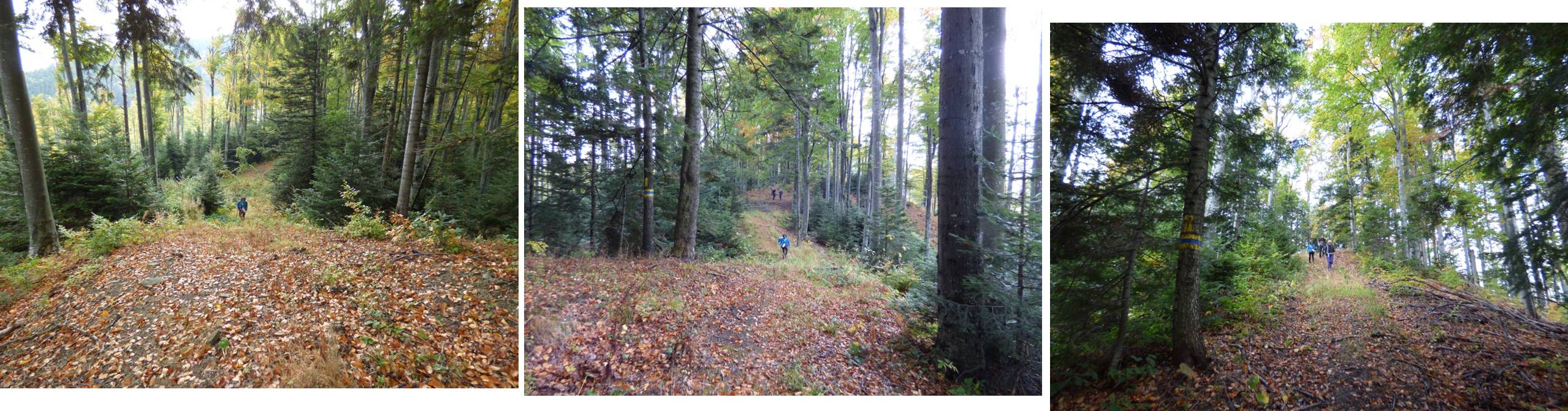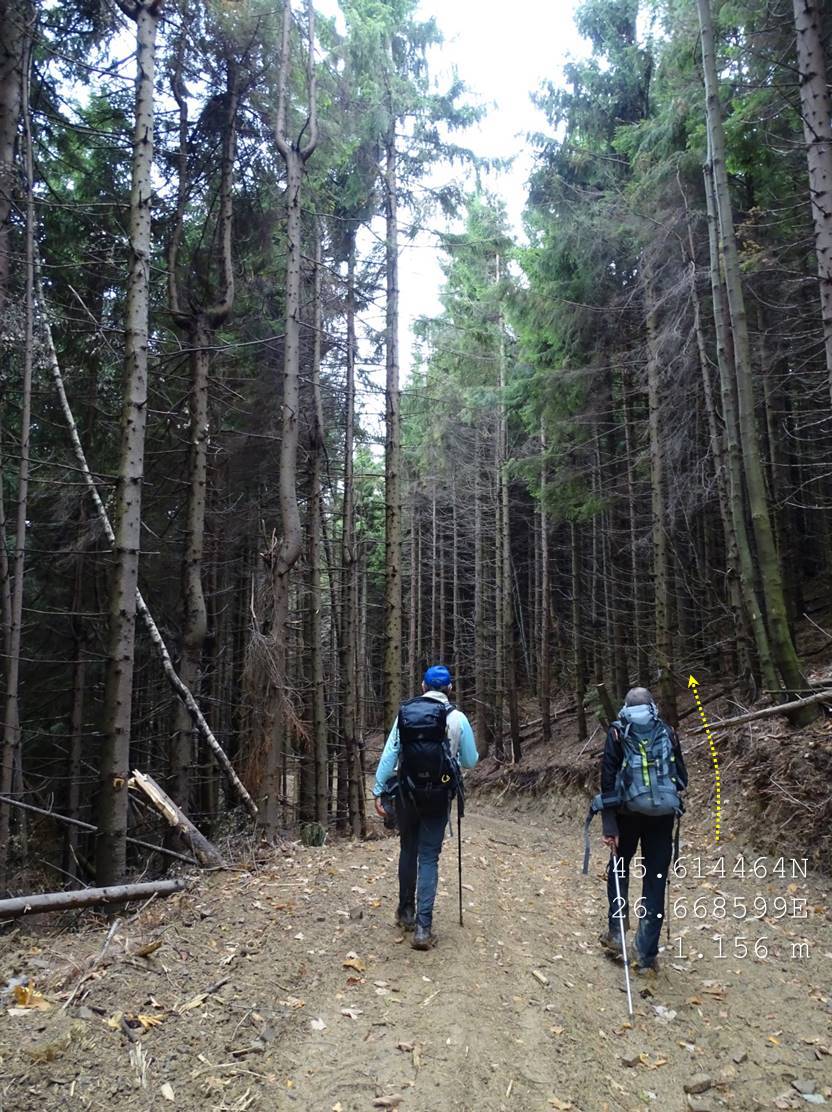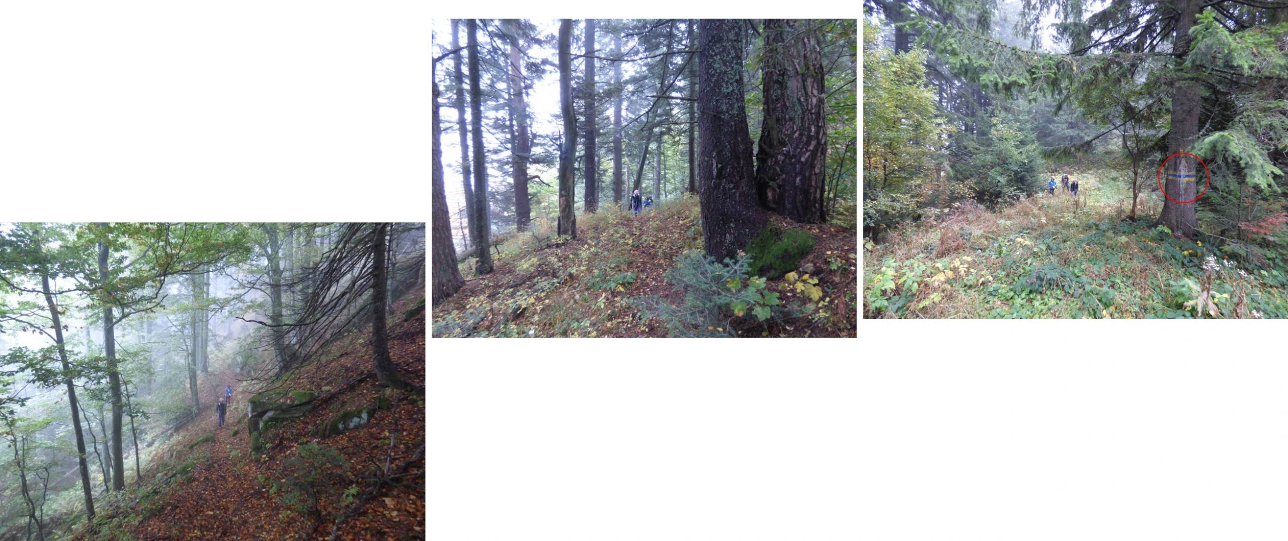 Culoarul sfârșește iar spre stânga coboară, puțin vizibile, urmele drumului de tractor; la fel fac și marcajele silvice, …