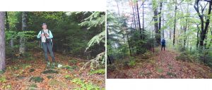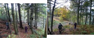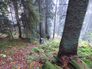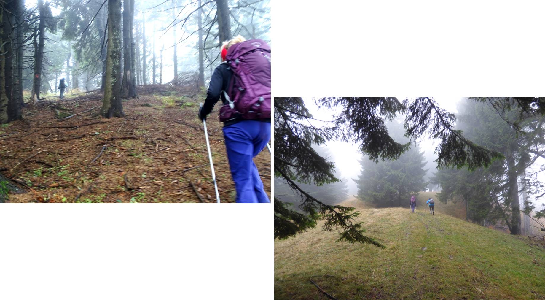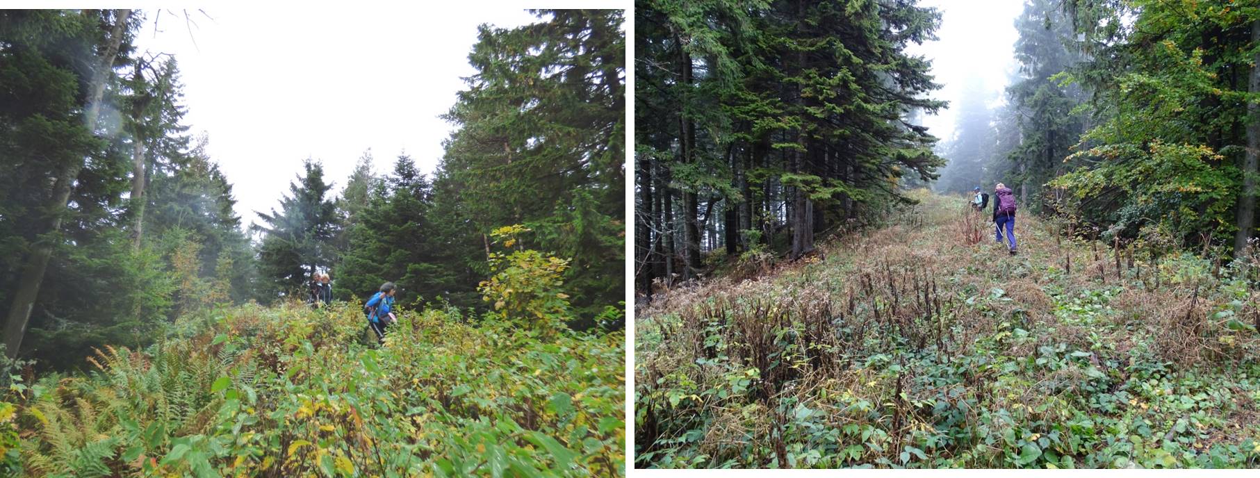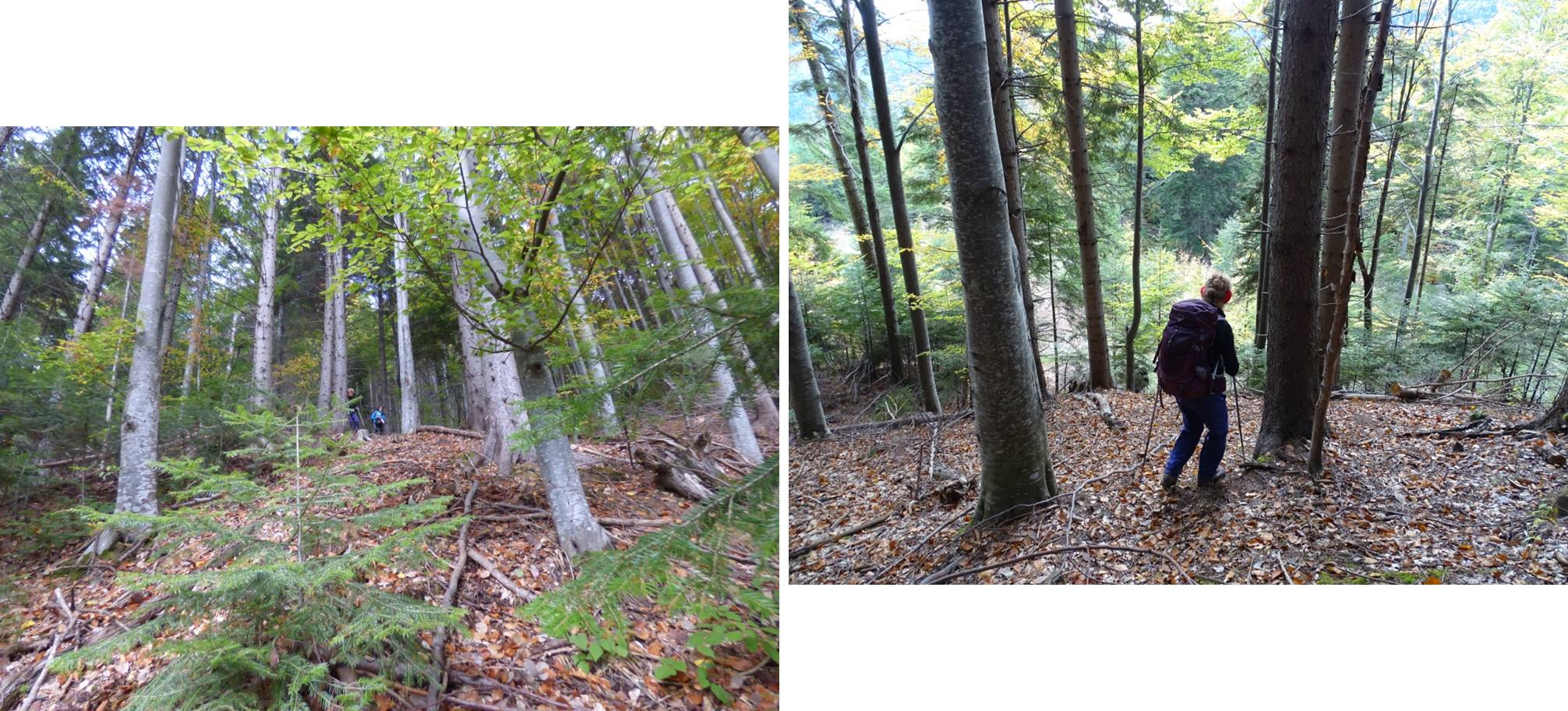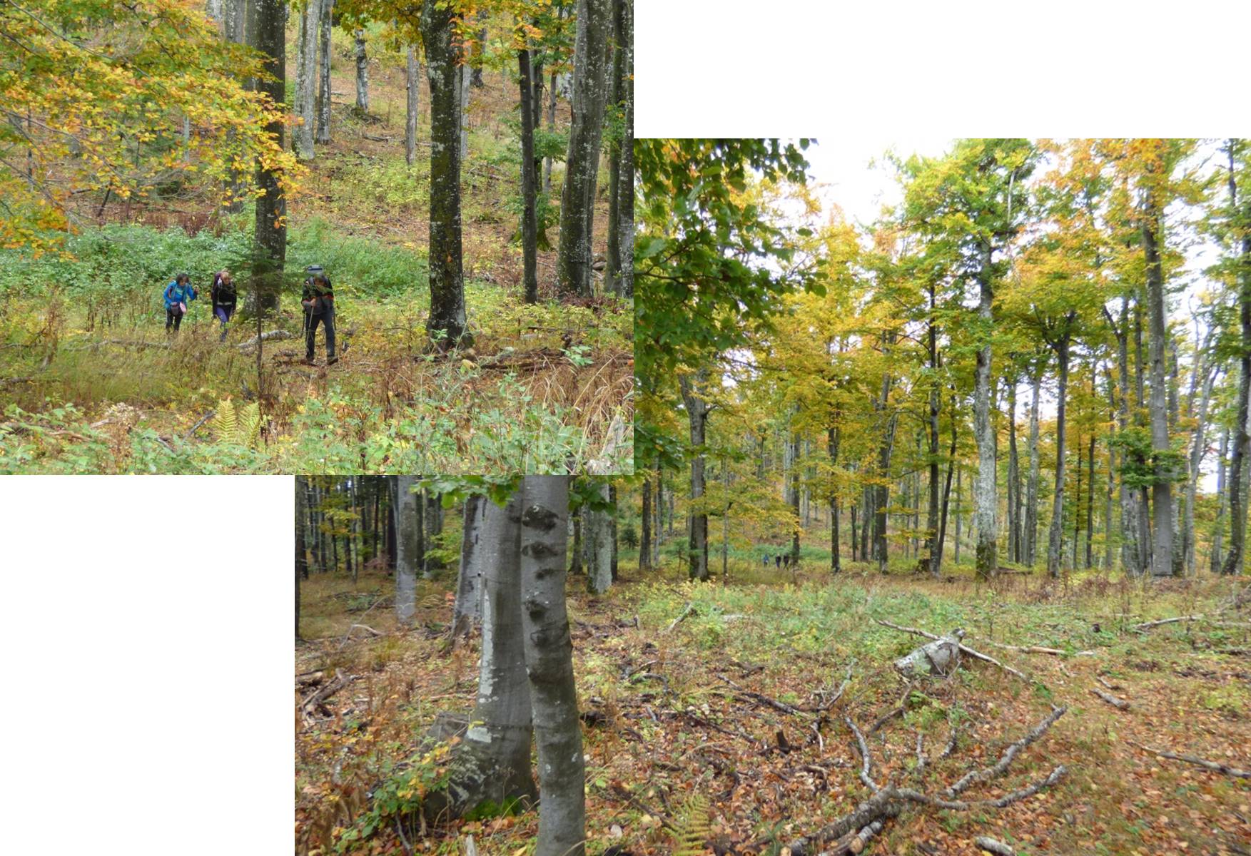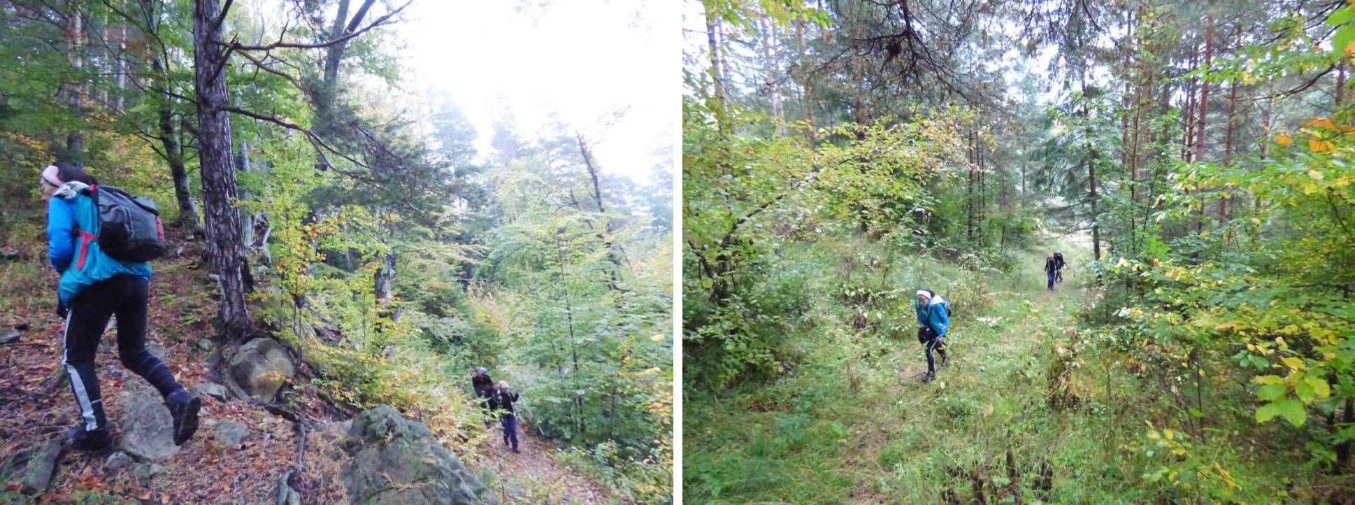 Culoarul sfârșește iar spre stânga coboară, puțin vizibile, urmele drumului de tractor; la fel fac și marcajele silvice, …