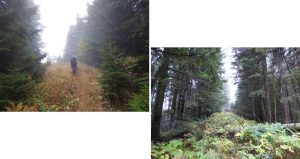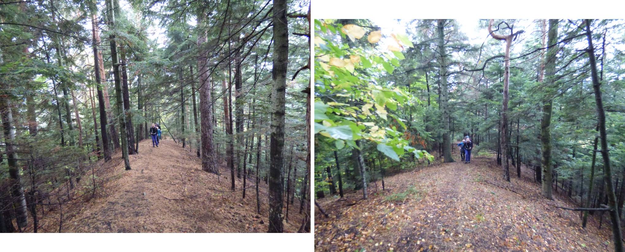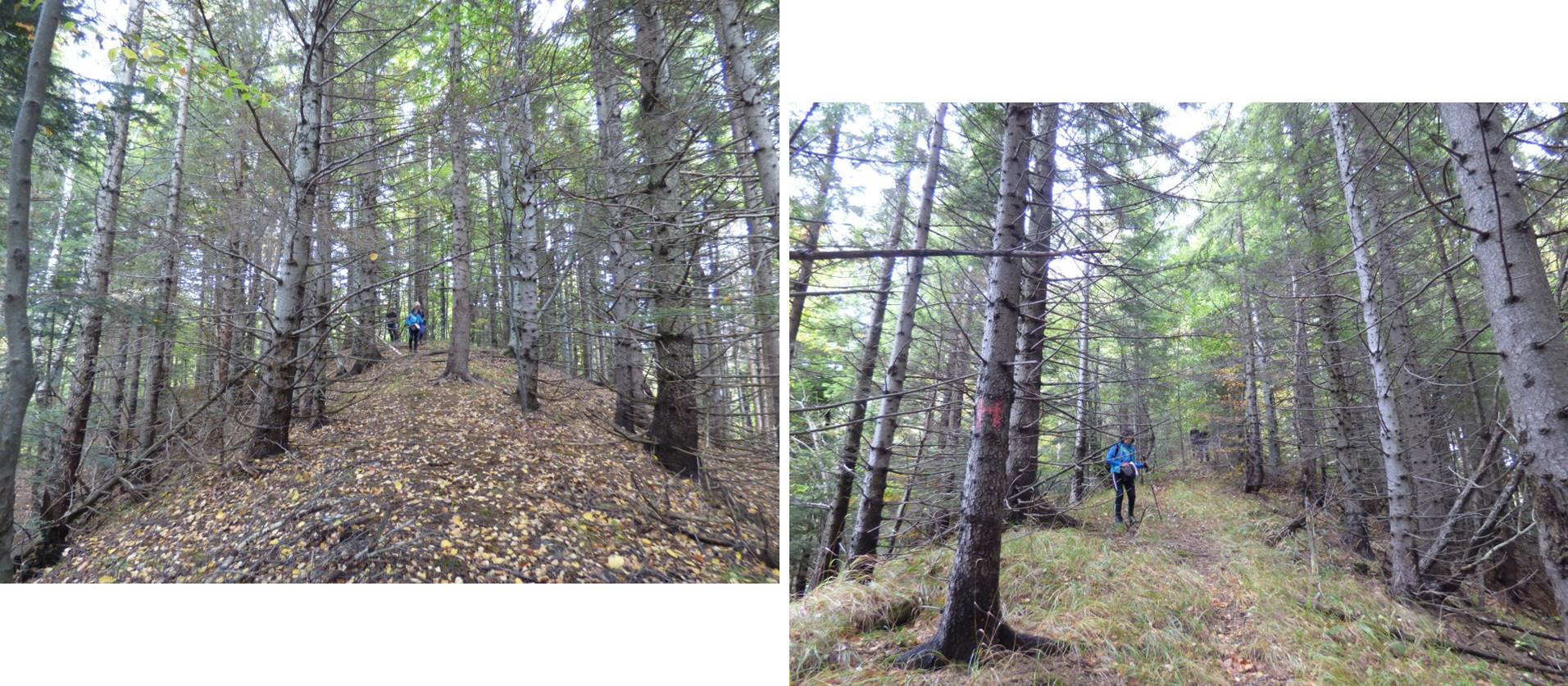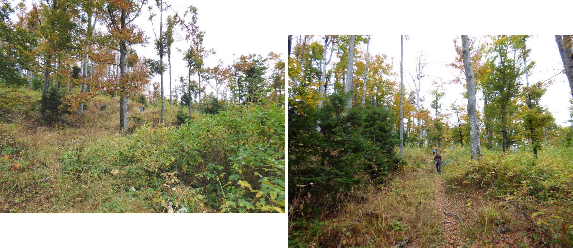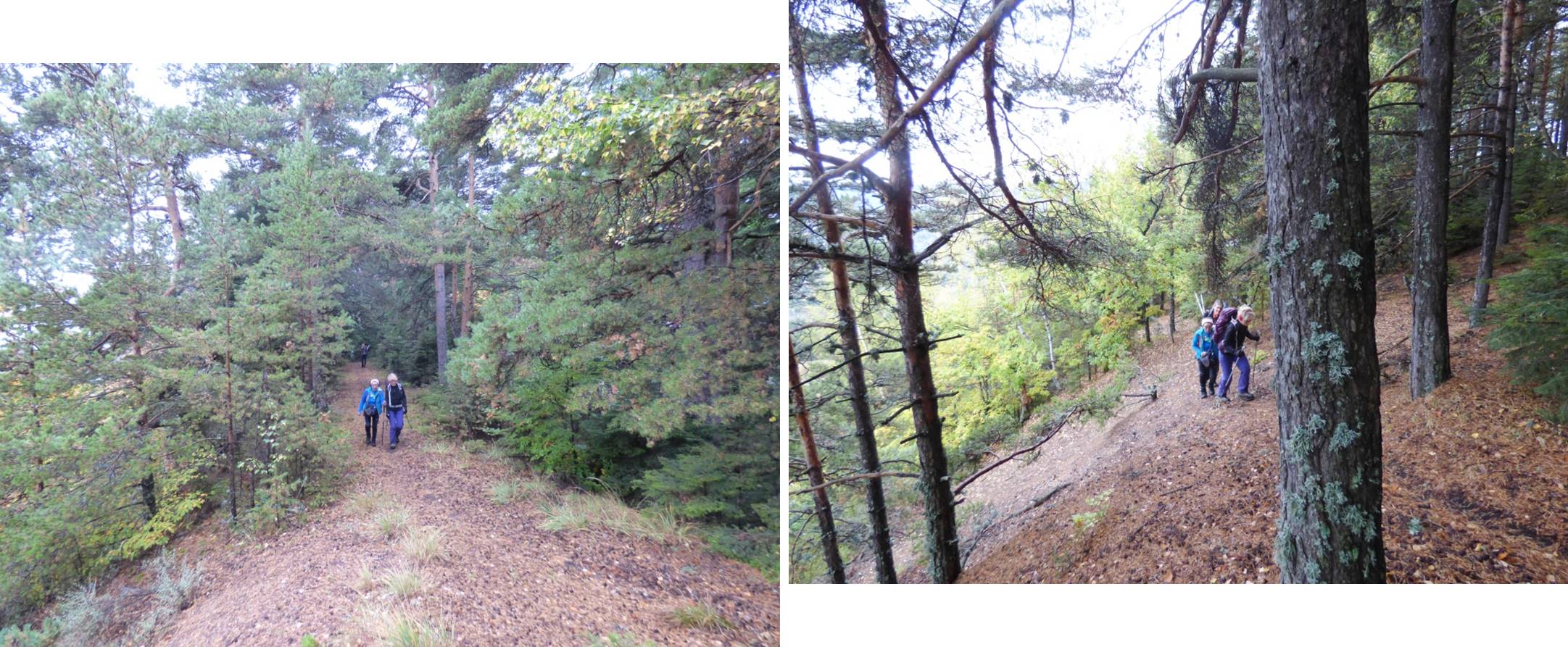 Din vârf se deschide spre nord, prin pădure, dar strict pe culme, un culoar larg și rectiliniu – poate linia unui vechi funicular, poate un fost drum de exploatare forestieră. Prin vegetația sălbatică ce îl acoperă se poate decela urma unei poteci pe care coborâm și noi; …