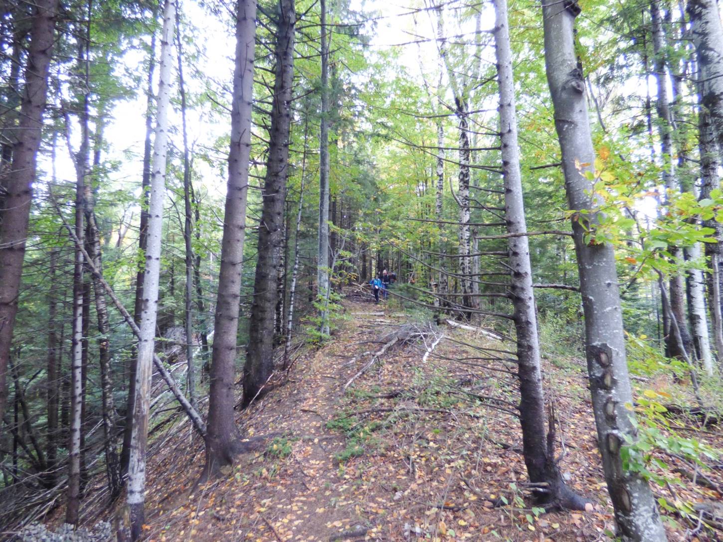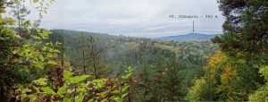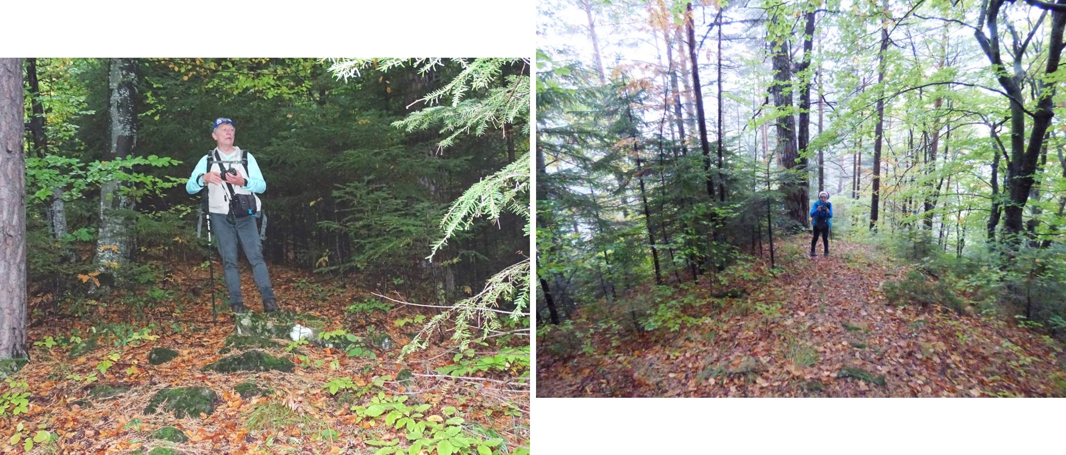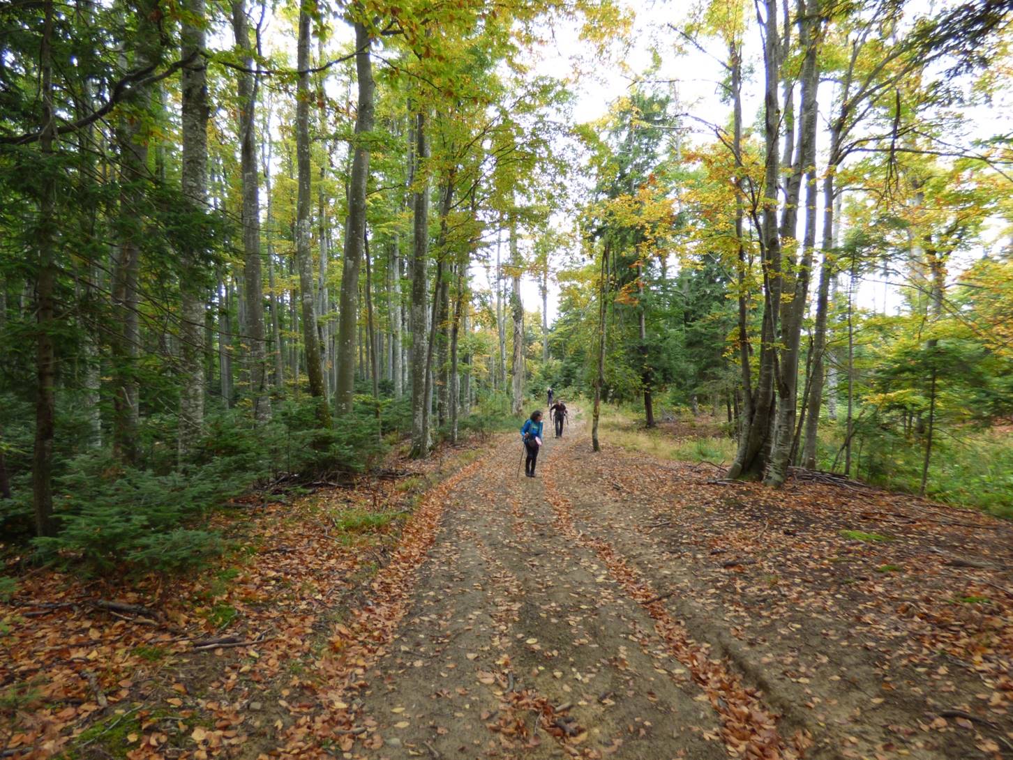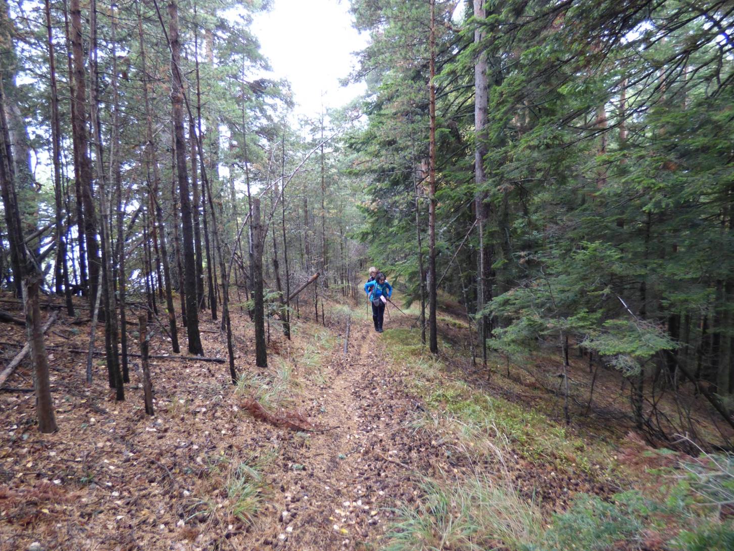 Din vârf se deschide spre nord, prin pădure, dar strict pe culme, un culoar larg și rectiliniu – poate linia unui vechi funicular, poate un fost drum de exploatare forestieră. Prin vegetația sălbatică ce îl acoperă se poate decela urma unei poteci pe care coborâm și noi; …