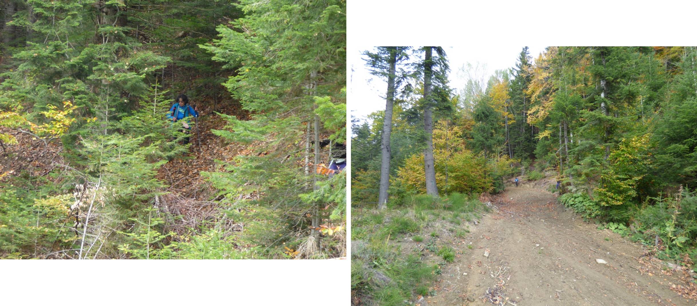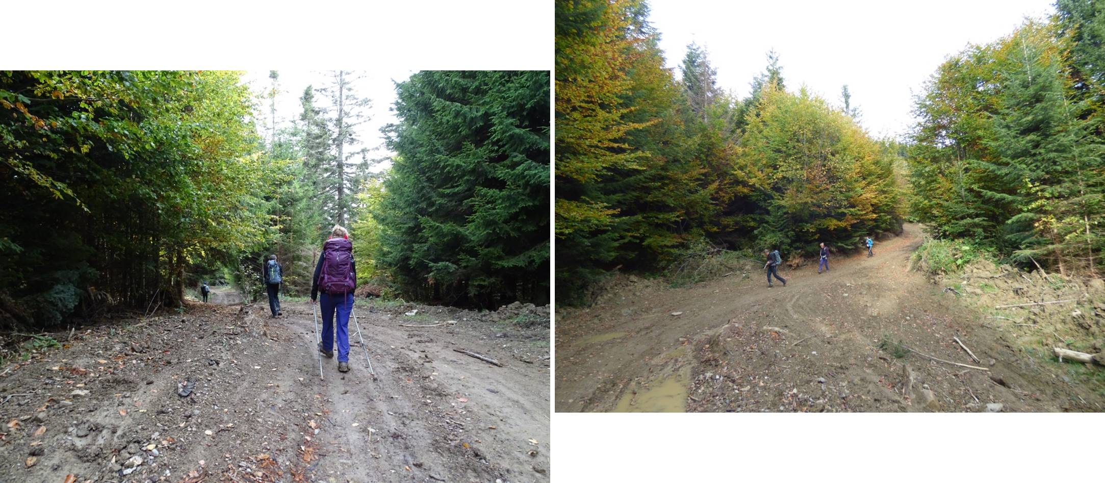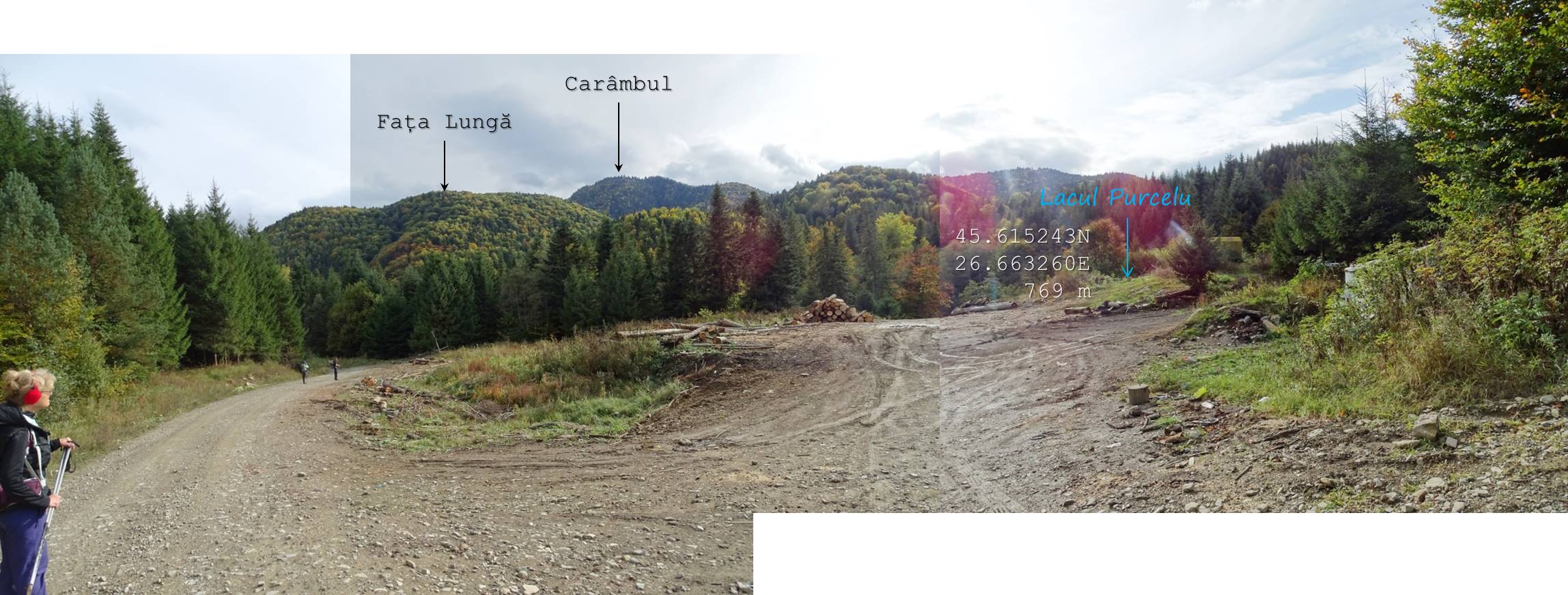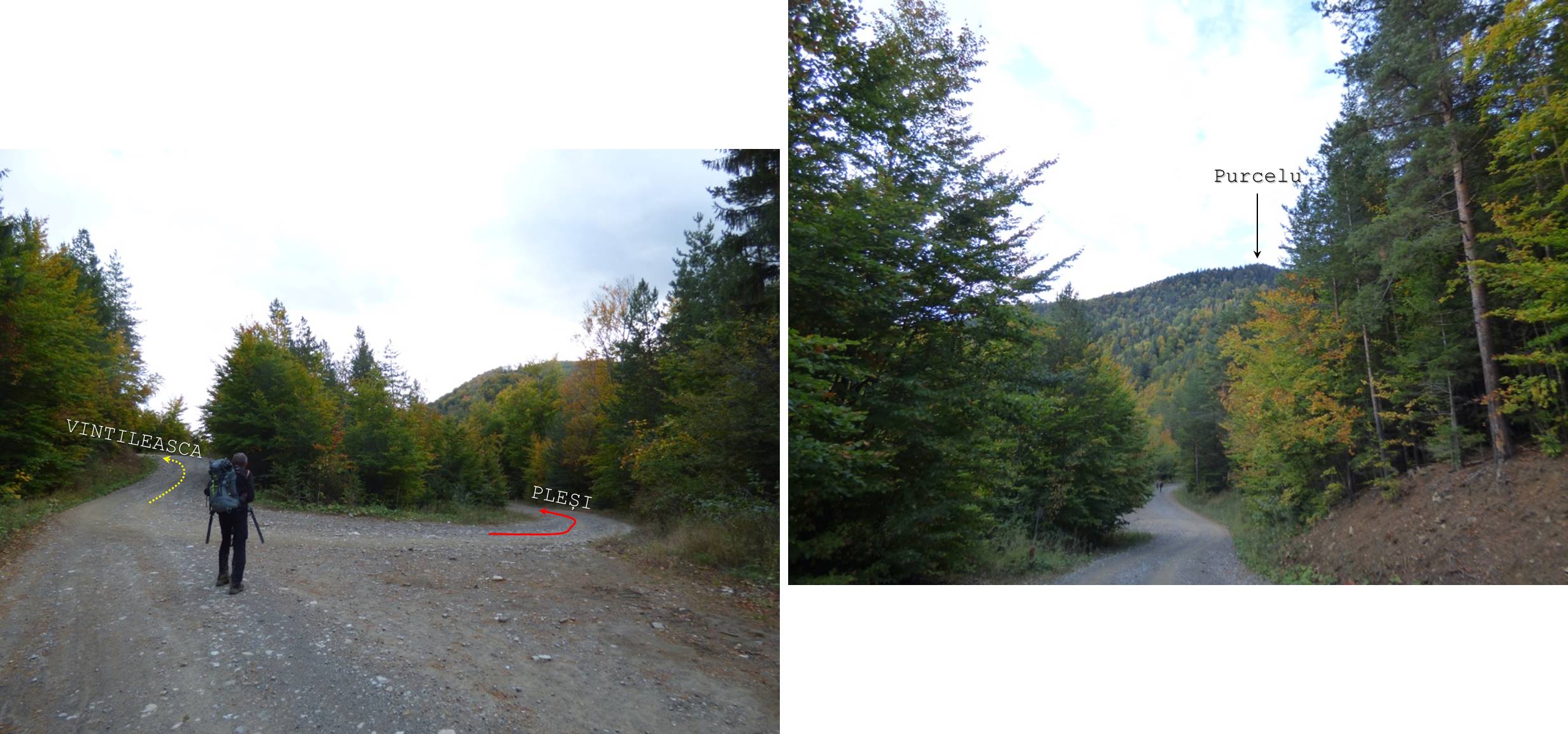 … se rupe după un kilometru și jumătate la confluența cu axialul a unui drum de tractor ce vine din albia Purcelului (și unde ar fi trebuit să căutăm Lacul Purcelu – a cărui fotografie a fost postată cândva pe Google Earth; aici a fost o alunecare ce, probabil a creat și un lac de baraj natural scurs între timp, barajul fiind distrus de lucrările forestiere) !