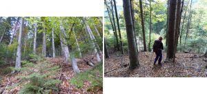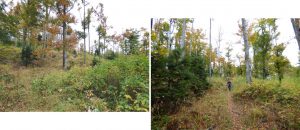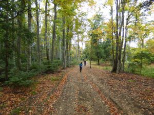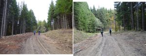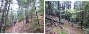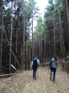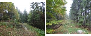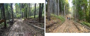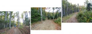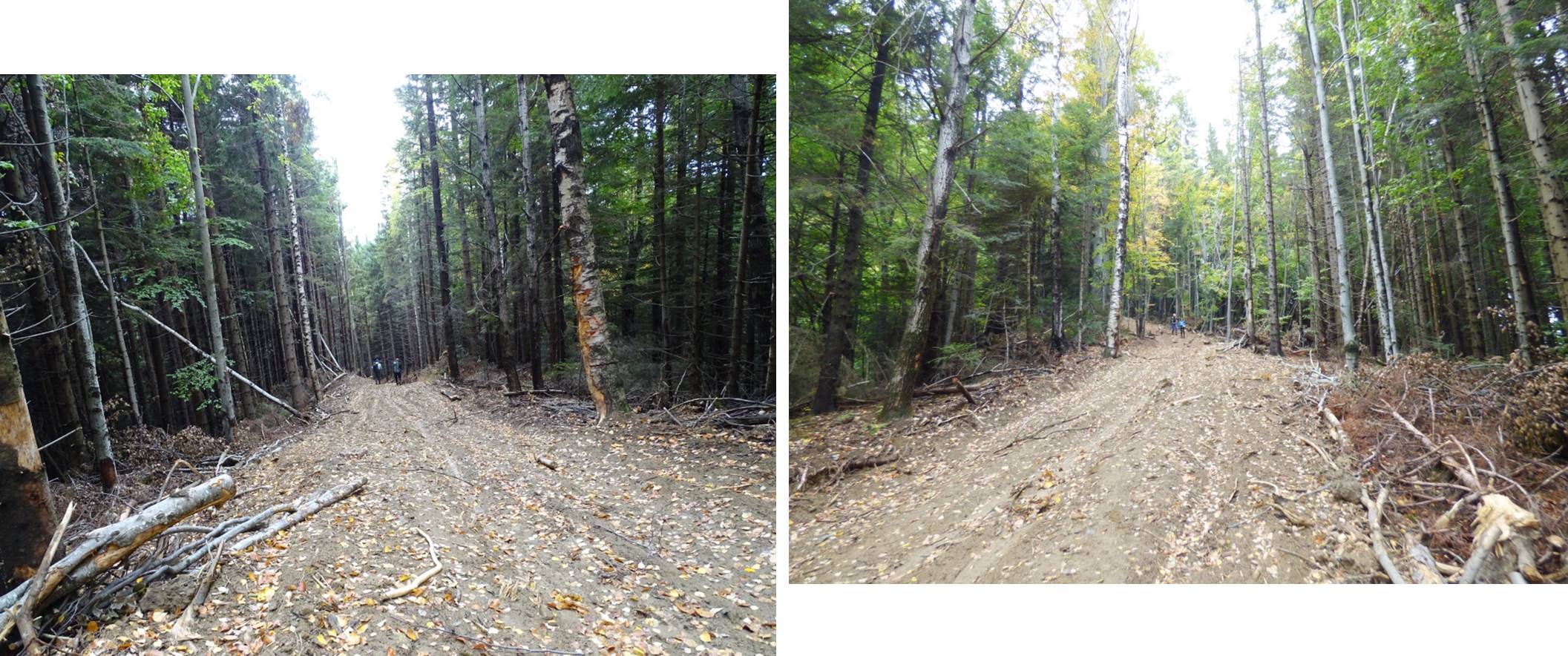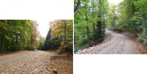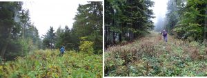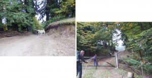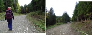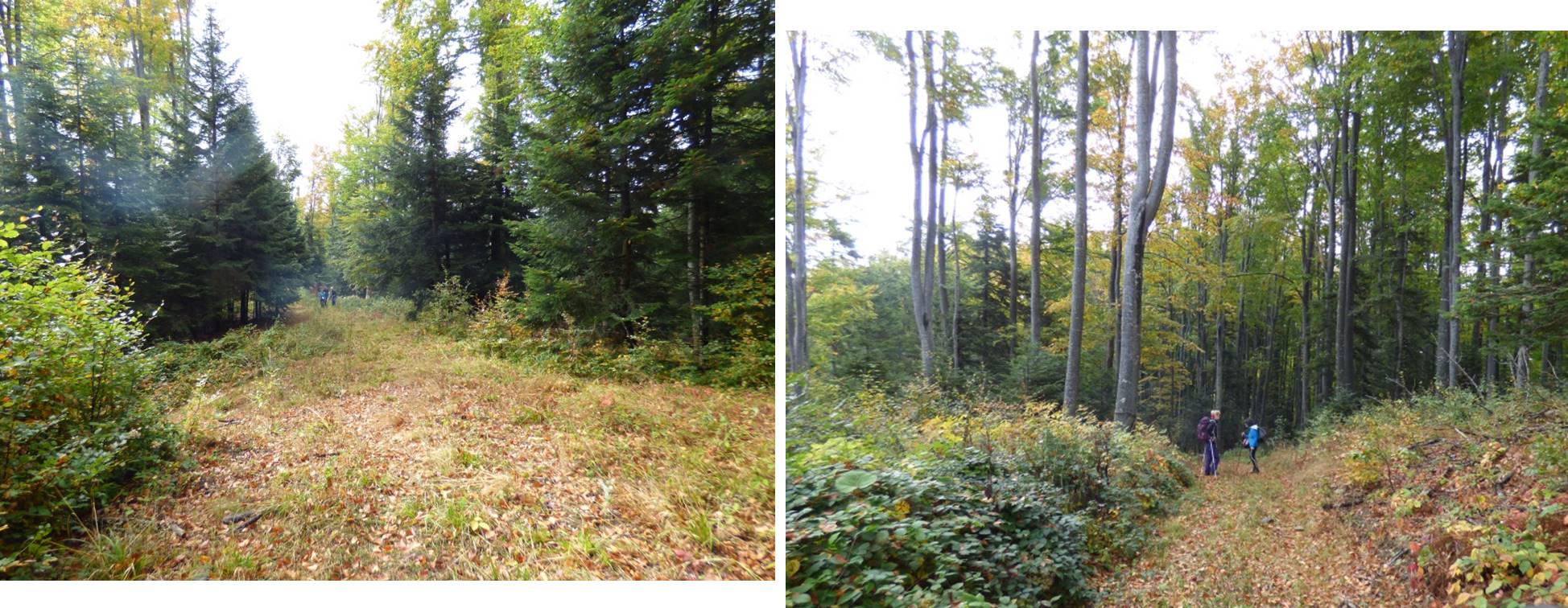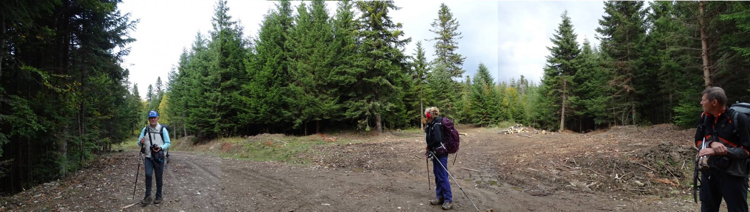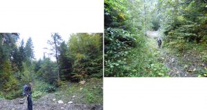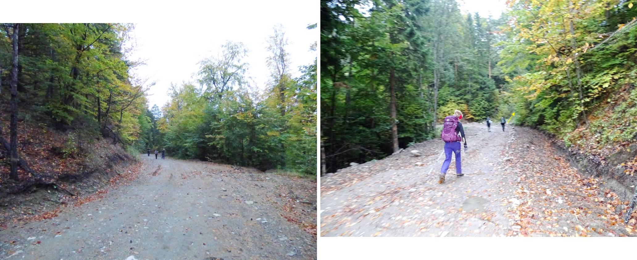 … se rupe după un kilometru și jumătate la confluența cu axialul a unui drum de tractor ce vine din albia Purcelului (și unde ar fi trebuit să căutăm Lacul Purcelu – a cărui fotografie a fost postată cândva pe Google Earth; aici a fost o alunecare ce, probabil a creat și un lac de baraj natural scurs între timp, barajul fiind distrus de lucrările forestiere) !