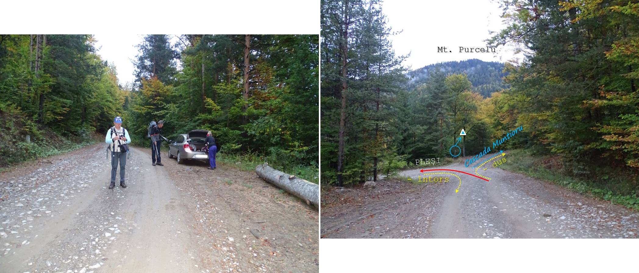 … și imediat la o … confluență de drumuri ! Acum chiar trebuie să acceptăm că suntem cam departe de traseul pe care ar fi trebuit să fim, coborând, de fapt, spre valea Purcelului !