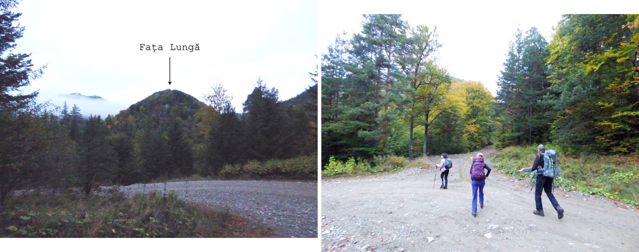 După aproape 1,5 km drumul forestier se estompează (cel trasat cu ocazia ultimelor defrișări coboară în valea Muntiorului)