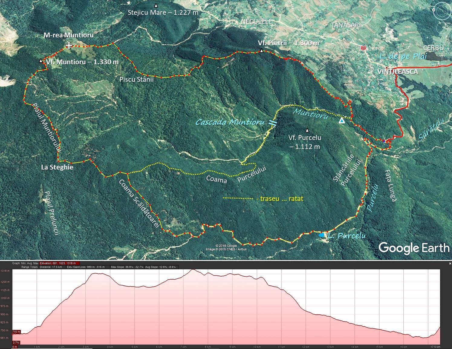 Traseu [5 octombrie 2019]: DF Vintileasca-Pleși – DF Muntioru – Dl. Piatra Neculei – M-rea Muntioru – Vf. Muntioru – Plaiul Muntiorului – Vf. La Steghie – Coama Scăldătoarei – Valea Purcelului (Lacul Purcelu, Stâncăriile Purcelului) – DF Vintileasca-Pleși