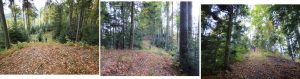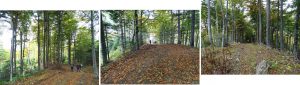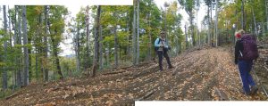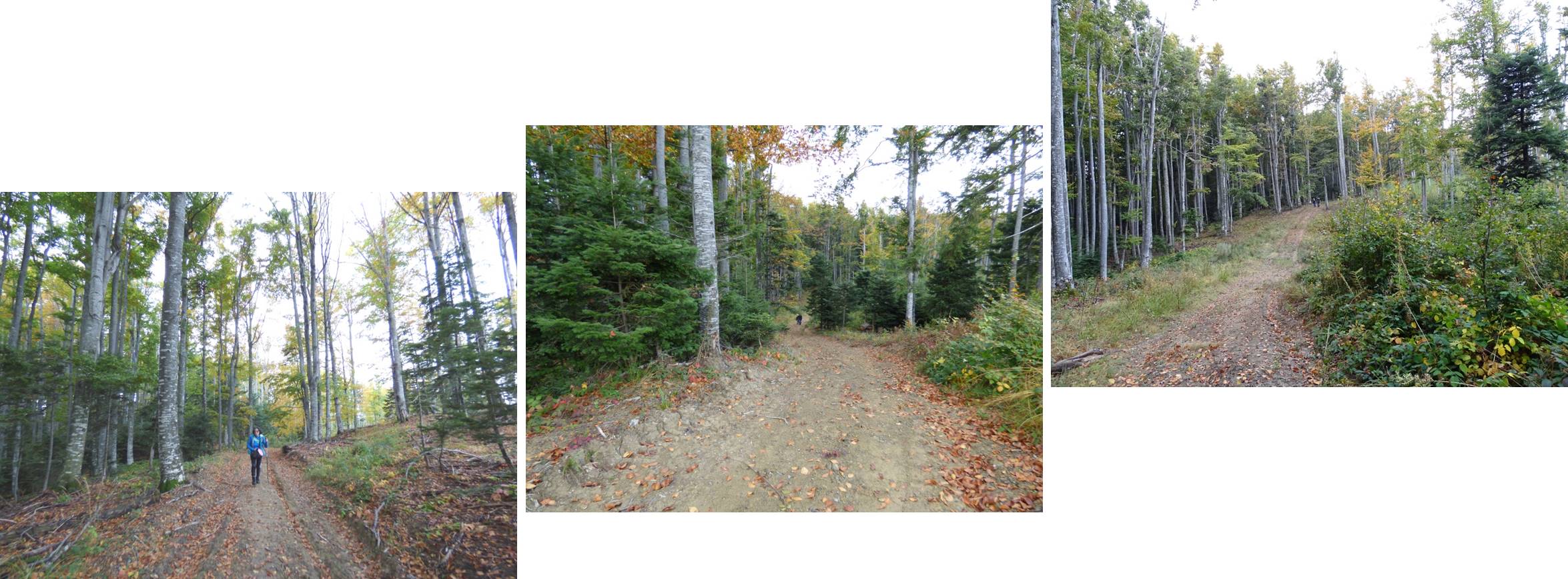 Drumul urmează strict coama interfluviului, acoperit cu păduri rărite de tăieri, …