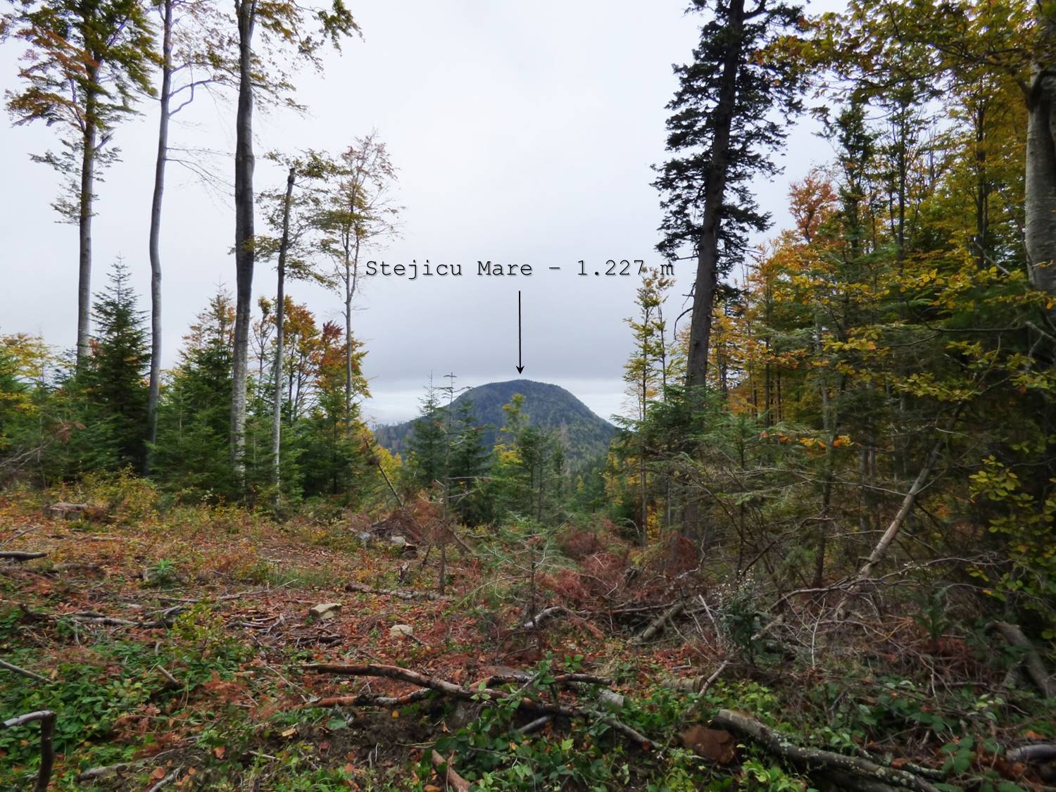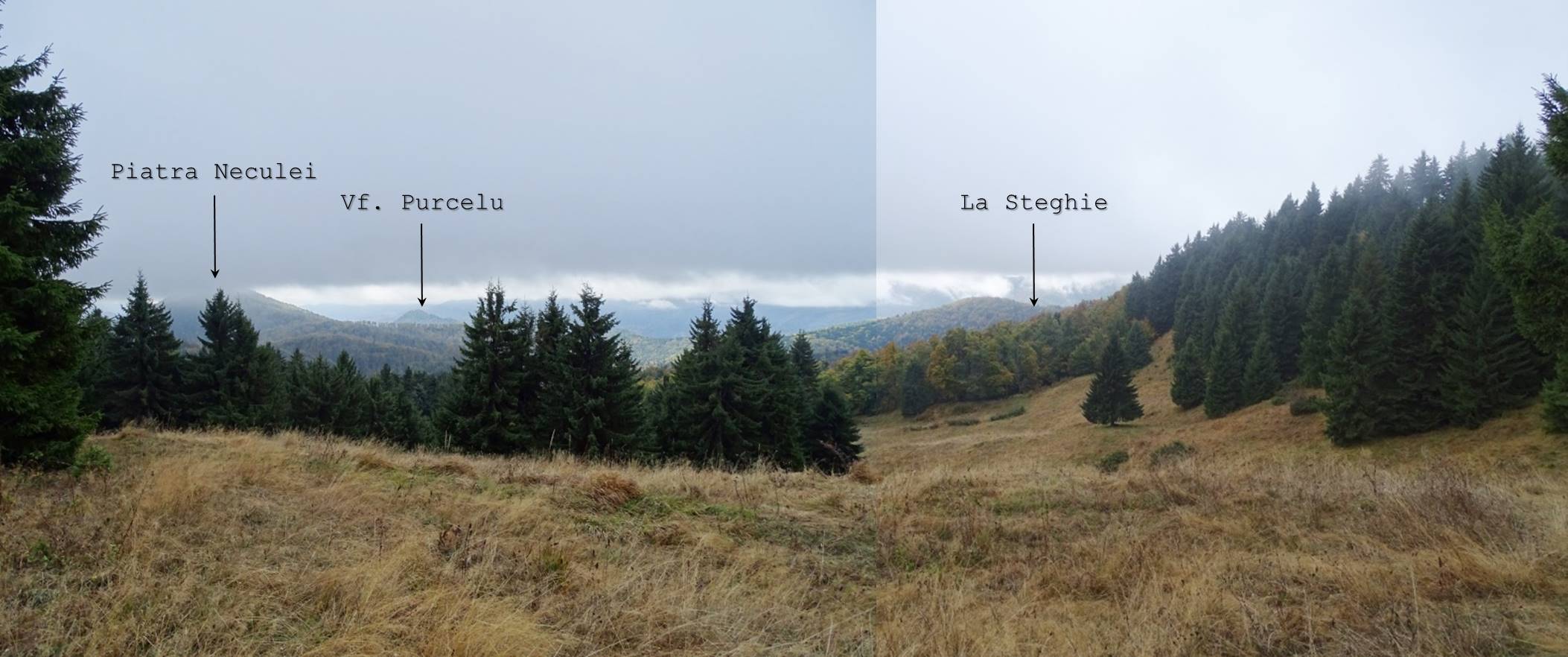Suntem într-o zonă indicată pe hărțile topografice sub numele La Steghie (probabil, corect, Șteghie de la Ștevie). De aici culmea începe să urce – direcția ei fiind indicată de “H”-urile hotarului silvic; spre stânga se formează interfluviul Muntioru-Purcelu, …