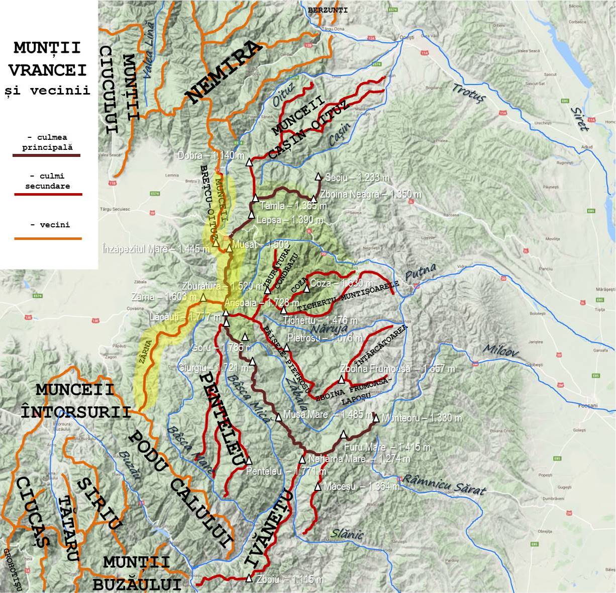 … culmea morfologică care ne intersează, e alcătuită din Munceii Brețcului – care leagă Munții Vrancei de Munții Nemira, sectorul nordic al culmii principale înalte și Munții Zârnei, care leagă Munții Vrancei de Munții Întorsurii.