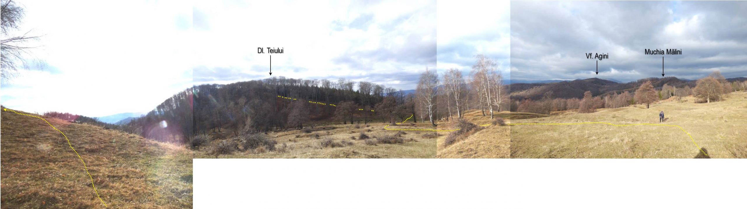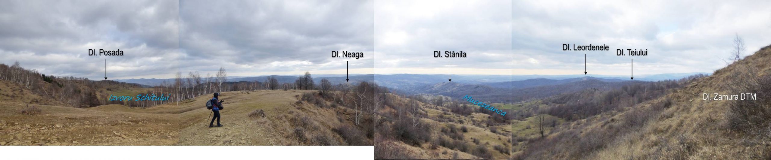 În ciuda aspectului său de vârf … adevărat, fără niciun motiv, l-am neglijat, preferând drumul ce-l ocolește pe la bază și râmâne în continuare sub culme. Am pierdut astfel belvederea pe care sigur ne-o oferea vârful, mai ales asupra văii Mucezeanca – implicit, asupra satului de pe ea – și asupra versantului ei stâng – calea noastră de întoarcere; dar a existat o compensație, așa cum se va vedea ! Așadar, ar fi trebuit să urcăm până pe vârf și apoi să coborâm pe piciorul care ne-ar fi readus pe drum – așa cum sugerează imaginea de mai sus !